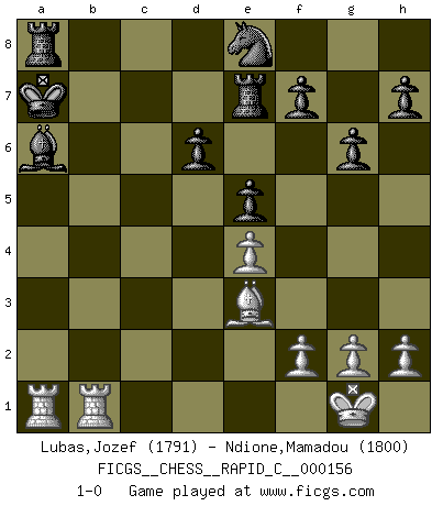 Last move : 1-0 2018 May 6 10:40:8 [Event "FICGS__CHESS__RAPID_C__000156"] [Site "FICGS"] [Date "2018.03.02"] [Round "1"] [White "Lubas,Jozef"] [Black "Ndione,Mamadou"] [Result "1-0"] [WhiteElo "1791"] [BlackElo "1800"] 1.e4 e5 2.Nf3 Nc6 3.Bb5 a6 4.Ba4 Nf6 5.O-O Bc5 6.c3 b5 7.Bc2 d6 8.d4 Bb6 9.a4 b4 10.dxe5 Nxe5 11.Nxe5 dxe5 12.Qxd8+ Kxd8 13.cxb4 a5 14.bxa5 Bxa5 15.Bd2 Bb6 16.Bc3 Re8 17.b4 Bb7 18.Nd2 Re7 19.a5 Ba7 20.b5 Bc5 21.a6 Bc8 22.Nc4 Bd6 23.Nxd6 cxd6 24.Bd3 Kc7 25.Rfc1 Kb8 26.Bb4 Ne8 27.b6 g6 28.a7+ Kb7 29.Ba6+ Kxb6 30.Ba5+ Kxa6 31.Rcb1 Kxa7 32.Bd2 Ba6 33.Be3+ 1-0 This chess game has been lost on time (started : 2018.03.02 2:49:32) Ruy Lopez : Moeller defense Kingside Castling by player White (move 5) Player White won this chess game. Follow this game move after move (download)Live, lose, and learn, by observing your opponent how to win. (Amber Steenbock) Es hat in meinem Leben Zeiten gegeben, da ich sehr nahe daran war zu glauben, daß ich auch nicht eine einzige Schachpartie verlieren könnte. (José Raúl Capablanca) En manos de Fischer's, una diminuta ventaja teórica es tan buena como tener una Reina de ventaja. (Isaac Kashdan) A ce moment-là, je menaçais de comprendre la position ! (Clément L'Heureux) Happy endings are just stories that haven't finished yet. (Jane Smith in Mr & Mrs Smith)