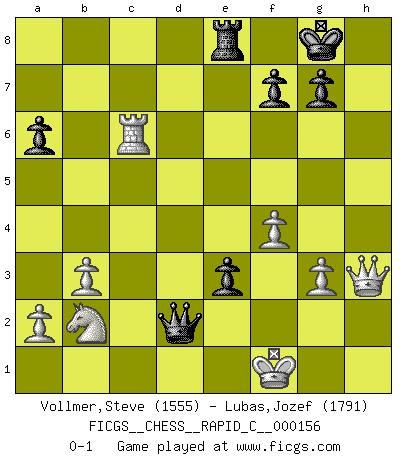 Last move : 0-1 2018 March 25 12:20:0 [Event "FICGS__CHESS__RAPID_C__000156"] [Site "FICGS"] [Date "2018.03.02"] [Round "1"] [White "Vollmer,Steve"] [Black "Lubas,Jozef"] [Result "0-1"] [WhiteElo "1555"] [BlackElo "1791"] 1.d4 Nf6 2.c4 e6 3.Nf3 d5 4.e3 c5 5.cxd5 exd5 6.Bb5+ Nc6 7.O-O cxd4 8.Nxd4 Bd7 9.Nc3 Bd6 10.b3 O-O 11.Bb2 a6 12.Nxc6 bxc6 13.Be2 Re8 14.Qd2 Ng4 15.g3 Qg5 16.Bxg4 Bxg4 17.f4 Qg6 18.Rfe1 h5 19.Na4 h4 20.Qg2 hxg3 21.hxg3 Ra7 22.Rac1 Rae7 23.Kf2 Bb4 24.Bc3 Bxc3 25.Rxc3 d4 26.Rxc6 Qd3 27.Nb2 Qd2+ 28.Kf1 Bh3 29.Qxh3 Rxe3 30.Rxe3 dxe3 0-1 Queen's pawn game Kingside Castling by player White (move 7) Kingside Castling by player Black (move 10) Player Black won this chess game. Follow this game move after move (download)The tactician must know what to do whenever something needs doing; the strategist must know what to do when nothing needs doing. (Savielly Tartakover) Schach ist Leben. (Robert James Fischer) La pasion por jugar al Ajedrez es una de las mas inexplicables en el mundo. (H.G. Wells) Les erreurs sont comme les malheurs, elles n'arrivent jamais seules. (Siegbert Tarrasch) The bottom line is always the bottom line. (Johann Piek)