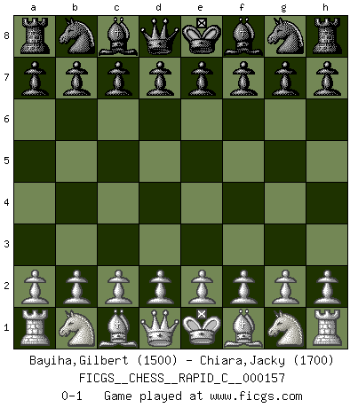 Last move : 0-1 2018 May 2 22:33:25 [Event "FICGS__CHESS__RAPID_C__000157"] [Site "FICGS"] [Date "2018.04.02"] [Round "1"] [White "Bayiha,Gilbert"] [Black "Chiara,Jacky"] [Result "0-1"] [WhiteElo "1500"] [BlackElo "1700"] 0-1 This chess game has been lost on time (started : 2018.04.02 21:0:15) Player Black won this chess game. Follow this game move after move (download)My style is somewhere between that of Tal and Petrosian. (Reshevsky) Moralische Siege zählen nicht. (Savielly Grigorievitsch Tartakower) Tu cuerpo tiene que estar en óptima condición. Tu Ajedrez se deteriora como lo hace tu cuerpo. No puedes separar la mente y el cuerpo. (Bobby Fischer) Les ravages du H expliquent la différence de niveau entre Tal et Thal [Abergel]. The problem with manipulation is that people can turn on you. (Horatio Caine, C.S.I. Miami)
