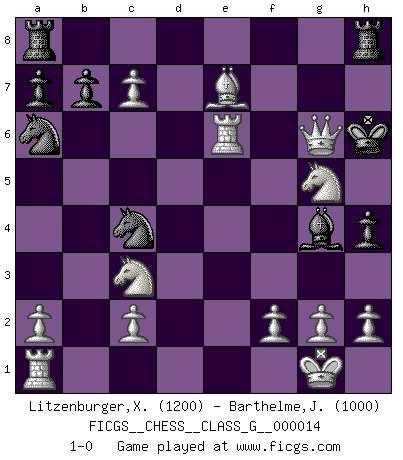 Last move : 1-0 2007 May 11 20:2:29 [Event "FICGS__CHESS__CLASS_G__000014"] [Site "FICGS"] [Date "2007.04.27"] [Round "1"] [White "Litzenburger,Xavier"] [Black "Barthelme,Jean Eudes"] [Result "1-0"] [WhiteElo "1200"] [BlackElo "1000"] 1.e4 e5 2.Nf3 Nc6 3.Bc4 Bc5 4.b4 Nf6 5.bxc5 Nxe4 6.O-O d6 7.Nc3 Nxc5 8.Ba3 h5 9.Re1 Na5 10.Bxf7+ Kxf7 11.d4 Na6 12.dxe5 h4 13.exd6 Nc4 14.Qd5+ Kf8 15.dxc7 Qe7 16.Bxe7+ Ke8 17.Qd8+ Kf7 18.Ng5+ Kg6 19.Qd3+ Kh5 20.Qf3+ Bg4 21.Qf7+ Kh6 22.Re6+ g6 23.Qxg6+ 1-0 Evans gambit declined Kingside Castling by player White (move 6) Player White won this chess game. Follow this game move after move (download)The hallmark of the artist is simplicity. (Larry Evans) Frage: Gibt es etwas was Sie mehr lieben als Autobahnen ohne Tempobegrenzungen? - Antwort: Deutsche Frauen ohne Tempobegrenzungen. (Loek van Wely) El muchacho (en ese entonces un niño de 12 años llamado Anatoly Karpov) no tiene ni idea de lo que es el Ajedrez y no hay futuro en absoluto para el en esta profesión. (Mikhail Botvinnik) Vouloir jouer aux échecs contre soi-même est aussi paradoxal que vouloir marcher sur son ombre. (Stefan Zweig) To steal ideas from one person is plagiarism. To steal from many is research. (Unknown)