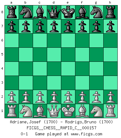 Last move : 0-1 2018 May 2 22:33:25 [Event "FICGS__CHESS__RAPID_C__000157"] [Site "FICGS"] [Date "2018.04.02"] [Round "1"] [White "Adriane,Josef"] [Black "Rodrigo,Bruno"] [Result "0-1"] [WhiteElo "1700"] [BlackElo "1700"] 0-1 This chess game has been lost on time (started : 2018.04.02 21:0:20) Player Black won this chess game. Follow this game move after move (download)The defensive power of a pinned piece is only imaginary. (Aaron Nimzovich) Der Schachmeister von Heute braucht Courage, einen Killerinstinkt, Ausdauer und Arroganz. (Larry Evans) Las ideas audaces son como las piezas del Ajedrez que avanzan hacia adelante. Ellas pueden ser vencidas, pero también pueden iniciar una partida victoriosa. (Goethe) Les Echecs ne sont pas pour les âmes timides. Ils requièrent un homme entier, qui ne s'arrête pas aveuglément à ce qui a été déjà établi, mais qui tente individuellement de sonder les profondeurs du jeu. (W. Steinitz) If you are good, you will be assigned all the work. If you are really good, you will get out of it. (Dan Rotaru)