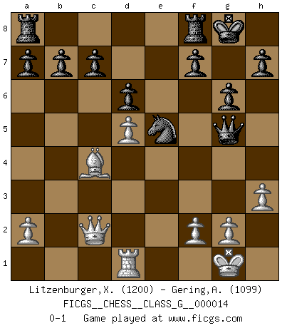Last move : 0-1 2007 May 2 19:52:11 [Event "FICGS__CHESS__CLASS_G__000014"] [Site "FICGS"] [Date "2007.04.27"] [Round "1"] [White "Litzenburger,Xavier"] [Black "Gering,Adrien"] [Result "0-1"] [WhiteElo "1200"] [BlackElo "1099"] 1.e4 e5 2.Nf3 Nc6 3.Bc4 Bc5 4.b4 Bxb4 5.c3 Ba5 6.d4 exd4 7.Bd2 Nf6 8.cxd4 Nxe4 9.O-O Bxd2 10.Nbxd2 Nxd2 11.Qxd2 O-O 12.d5 Ne7 13.Rfe1 d6 14.Rad1 Bg4 15.Qd3 Ng6 16.h3 Ne5 17.Ng5 g6 18.Qc2 Bxd1 19.Rxd1 Qxg5 0-1 Evans gambit Kingside Castling by player White (move 9) Kingside Castling by player Black (move 11) Player Black won this chess game. Follow this game move after move (download)Chess is as much a mystery as women. (Purdy) Der 70jährige Viktor Kortschnoi: Die Rentenanstalt wollte mich zwingen in Rente zu gehen. Meine Frau erhält jetzt eine Pension- und ich zahle weiter in die Rentenkasse ein! (Viktor Kortschnoi) En el Ajedrez, tal como es jugado por los Maestros, practicamente la suerte es eliminada. (Emanuel Lasker) Les échecs sont un jeu par leur forme, un art par leur essence et une science par sa difficulté d'acquisition. Ils peuvent vous procurer autant de plaisir qu'un bon livre ou une belle musique, mais vous n'aurez une réelle joie que si vous arrivez à bien jouer. (Tigran Petrosian) Wisdom doesn't necessarily come with age. Sometimes age just shows up all by itself. (Tom Wilson)