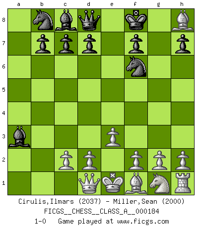 Last move : 1-0 2018 April 22 21:35:23 [Event "FICGS__CHESS__CLASS_A__000184"] [Site "FICGS"] [Date "2018.03.03"] [Round "1"] [White "Cirulis,Ilmars"] [Black "Miller,Sean"] [Result "1-0"] [WhiteElo "2037"] [BlackElo "2000"] 1.b4 e5 2.a3 a5 3.Bb2 axb4 4.Bxe5 bxa3 5.Nxa3 Rxa3 6.Rxa3 Bxa3 7.Bxg7 Nf6 8.Bxh8 Kf8 9.e3 1-0 This chess game has been lost on time (started : 2018.03.03 17:54:8) Polish (Sokolsky) opening Player White won this chess game. Follow this game move after move (download)First-class players lose to second-class players because second-class players sometimes play a first-class game. (Siegbert Tarrasch) Jede Eröffnung ist gut genug um gespielt zu werden, wenn nur ihr Ruf schlecht genug ist. (Savielly Grigorievitsch Tartakower) Del Ajedrez se ha dicho que la vida no es lo suficientemente larga para él, pero eso es culpa de la vida, no del Ajedrez. (William Ewart Napier) Ce n'est pas pour s'amuser qu'il joue aux échecs : il célèbre un culte. (Vladimir Nabokov) Thibault, I ask for draw. Game 13876. - Sorry Ilmars, you won. (FICGS chat)