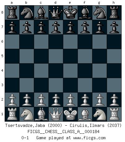 Last move : 0-1 2018 April 12 20:55:8 [Event "FICGS__CHESS__CLASS_A__000184"] [Site "FICGS"] [Date "2018.03.03"] [Round "1"] [White "Tsertsvadze,Jaba"] [Black "Cirulis,Ilmars"] [Result "0-1"] [WhiteElo "2000"] [BlackElo "2037"] 0-1 This chess game has been lost on time (started : 2018.03.03 17:54:8) Player Black won this chess game. Follow this game move after move (download)Chess makes man wiser and clear-sighted. (Vladimir Putin) Ich glaube, ich kenne inzwischen die Gründe für mein Versagen: schachliche Charakterfehler. Ich war nie ein Wunderkind und in meiner gesamten menschlichen Entwicklung immer zu langsam. (Viktor Kortschnoi) Creo que una cierta cantidad de temperamento es esperada de los genios del Ajedrez. (Ron Gross) Fischer est le meilleur joueur du monde et Karpov n'est qu'un joueur de bistrot. (Garry Kasparov, agé de 16 ans) There is a great deal of difference between an eager man who wants to read a book and a tired man who wants a book to read. (G.K. Chesterton)