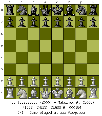 Last move : 0-1 2018 April 12 20:55:8 [Event "FICGS__CHESS__CLASS_A__000184"] [Site "FICGS"] [Date "2018.03.03"] [Round "1"] [White "Tsertsvadze,Jaba"] [Black "Maksimov,Andrei"] [Result "0-1"] [WhiteElo "2000"] [BlackElo "2000"] 0-1 This chess game has been lost on time (started : 2018.03.03 17:54:8) Player Black won this chess game. Follow this game move after move (download)You know, comrade Pachman, I don't enjoy being a Minister, I would rather play Chess like you. (Che Guevara) Es tut gut, die Entwicklungsperiode von, [...] demokratischem Geist durchdringen zu lassen. Wie undemokratisch wäre es doch beispielsweise, den einen Offizier große Spaziertouren vornehmen zu lassen, während die anderen zu Hause säßen und sich entsetzlich langweilten. (Aaron Nimzowitsch) El Ajedrez es un expediente tonto que hace creer a la gente inactiva que hacen una cosa muy astuta cuando solamente estan perdiendo su tiempo. (George Bernard Shaw) Vous m'avez demandé de vous exposer quel est le fondement de la prière. Je ne fais que préparer les pièces du jeu sur la table... Nous sera-t-il permis d'en adopter les règles et si nous les appliquons scrupuleusement nous ne tarderons pas à faire mat le Roi divin ! Il ne pourra échapper à nos mains. (Sainte Thérèse d'Avila, Chemin de perfection) I would love to change the world, but they won't give me the source code. (Unknown)