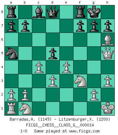 Last move : 1-0 2007 May 2 19:59:39 [Event "FICGS__CHESS__CLASS_G__000014"] [Site "FICGS"] [Date "2007.04.27"] [Round "1"] [White "Barradas,Anderson"] [Black "Litzenburger,Xavier"] [Result "1-0"] [WhiteElo "1149"] [BlackElo "1200"] 1.e4 e5 2.Nf3 Nc6 3.Bc4 Bc5 4.O-O Nf6 5.Re1 Ng4 6.c3 Bxf2+ 7.Kh1 Bxe1 8.Qxe1 d6 9.d3 O-O 10.Qg3 Na5 11.h3 d5 12.Bxd5 Nf6 13.c4 c6 14.Bh6 Nh5 15.Qxe5 cxd5 16.Qxh5 1-0 Giuoco Piano Kingside Castling by player White (move 4) Kingside Castling by player Black (move 9) Player White won this chess game. Follow this game move after move (download)We like to think. (Gary Kasparov) Du musst Deinen Gegner in einen tiefen dunklen Wald führen wo 2+2=5 ist und wo der Weg, der wieder hinausführt, nur breit genug für einen ist. (Mikhail Nekhemyevich Tal) El jugador táctico sabe que hacer cuando hay algo que hacer; mientras que el estratega sabe que hacer cuando no hay nada que hacer. (Gerald Abrahams) Il n'y a plus de joueurs du niveau de Jacob Murray dont la seule quête est le beau jeu, le plaisir de voir les pièces construire quelque chose. Sur 10 idées à la minute, 9 seront sans intérêt, la dernière s'avèrera géniale. (Christian Bauer) Fortune favours the audacious. (Desiderius Erasmus)