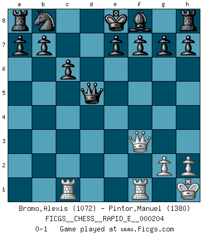 Last move : 0-1 2018 March 9 18:13:58 [Event "FICGS__CHESS__RAPID_E__000204"] [Site "FICGS"] [Date "2018.03.04"] [Round "1"] [White "Bromo,Alexis"] [Black "Pintor,Manuel"] [Result "0-1"] [WhiteElo "1072"] [BlackElo "1380"] 1.d4 d5 2.c4 c6 3.c5 Bf5 4.Nc3 Nf6 5.f3 Bg6 6.e4 dxe4 7.fxe4 Nxe4 8.Nxe4 Bxe4 9.Nf3 Bxf3 10.Qxf3 Qxd4 11.Be2 Qxc5 12.Be3 Qb4+ 13.Bd2 Qxb2 14.Rd1 Qxa2 15.O-O Qd5 16.Ba5 Qxa5 17.Bc4 Qc5+ 18.Kh1 Qxc4 19.Rc1 Qd5 0-1 QGD Slav defense Kingside Castling by player White (move 15) Player Black won this chess game. Follow this game move after move (download)During a Chess competition a Chessmaster should be a combination of a beast of prey and a monk. (Alexander Alekhine) Ich verachte Kasparow. (Viktor Kortschnoi) El juego de Fischer siempre fue nítido, racional y brillante. Uno de los mejores por siempre. (Dave Regis) Les Echecs représentent une sphère d'idées créatrices basée sur la volonté des deux protagonistes. (Smyslov) Nobody is always a winner, and anybody who says he is, is either a liar or doesn't play poker. (Amarillo Slim)