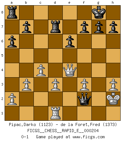 Last move : 0-1 2018 April 14 20:30:30 [Event "FICGS__CHESS__RAPID_E__000204"] [Site "FICGS"] [Date "2018.03.04"] [Round "1"] [White "Pipac,Darko"] [Black "de la Foret,Fred"] [Result "0-1"] [WhiteElo "1123"] [BlackElo "1373"] 1.e4 c5 2.Nf3 d6 3.h3 Nf6 4.Nc3 Nc6 5.Bb5 Bd7 6.d3 a6 7.Bxc6 Bxc6 8.O-O e6 9.Bg5 Be7 10.Qe2 O-O 11.e5 Nd5 12.Bxe7 Nxe7 13.exd6 Qxd6 14.Ne5 Rad8 15.Rfe1 Nf5 16.Nxc6 Qxc6 17.Qe4 Qb6 18.b3 Nd4 19.Na4 Qa5 20.Rac1 Rd5 21.c4 Rd7 22.Rcd1 Ra8 23.Rd2 Qxd2 24.Nxc5 Nf3+ 25.gxf3 Qg5+ 26.Kh2 Qxc5 27.Rg1 Qd4 28.Rd1 Qxf2+ 0-1 Sicilian Kingside Castling by player White (move 8) Kingside Castling by player Black (move 10) Player Black won this chess game. Follow this game move after move (download)Chess is in its essence a game, in its form an art, and in its execution a science. (Baron Tassilo) Bogoljubow: Matt in vier Zügen! Tartakower: Ich verbitte mir jede Belästigung! (Savielly Grigorievitsch Tartakower) Un jugador que trata de regresar una movida en el Ajedrez es un futuro carterista. (Richard Fenton) Je fais ceci parce que dans cinquante coups j'obtiendrai cela; je m'appelle Mikhail Moisevitch Botvinnik. (Botvinnik) Plans are ideas that never come to fruition. (Daniel Parmet)