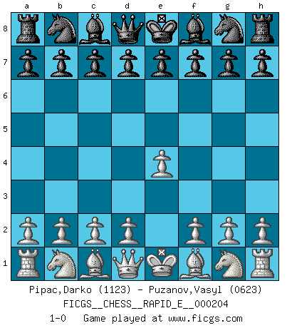 Last move : 1-0 2018 April 4 8:3:31 [Event "FICGS__CHESS__RAPID_E__000204"] [Site "FICGS"] [Date "2018.03.04"] [Round "1"] [White "Pipac,Darko"] [Black "Puzanov,Vasyl"] [Result "1-0"] [WhiteElo "1123"] [BlackElo "0623"] 1.e4 1-0 This chess game has been lost on time (started : 2018.03.04 22:27:20) King's pawn Opening Player White won this chess game. Follow this game move after move (download)By the beauty of his games, the clarity of his play, and the brilliance of his ideas, Fischer made himself an artist of the same stature as Brahms, Rembrandt, and Shakespeare. (David Levy) Ohne Leiden bildet sich kein Charakter. (Ernst Freiherr von Feuchtersleben) Todavía soy una víctima del Ajedrez. Tiene toda la belleza del arte y mucho mas. No puede ser comercializado. El Ajedrez es mas puro que el arte en su posición social. (Marcel Duchamp) Il vaut mieux sacrifier les pièces de l'adversaire. (Xavier Tartacover) Do not put your faith in what statistics say until you have carefully considered what they do not say. (William W. Watt)
