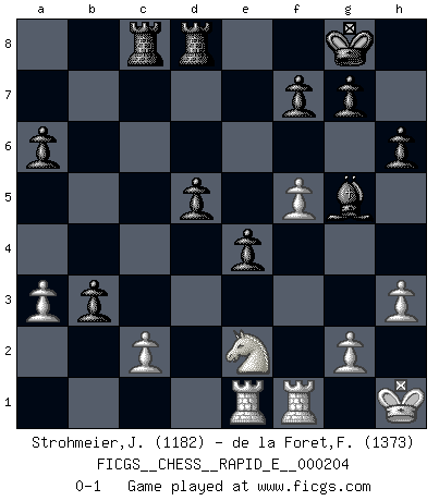 Last move : 0-1 2018 June 15 22:33:24 [Event "FICGS__CHESS__RAPID_E__000204"] [Site "FICGS"] [Date "2018.03.04"] [Round "1"] [White "Strohmeier,Josef"] [Black "de la Foret,Fred"] [Result "0-1"] [WhiteElo "1182"] [BlackElo "1373"] 1.e4 c5 2.Nf3 d6 3.d4 cxd4 4.Nxd4 Nf6 5.Nc3 a6 6.Be2 e5 7.Nb3 Be7 8.O-O O-O 9.h3 Be6 10.Bg5 Nbd7 11.Kh1 b5 12.a3 Qc7 13.Qd2 Rac8 14.Rad1 Rfd8 15.f4 h6 16.Bxf6 Nxf6 17.f5 Bc4 18.Bxc4 bxc4 19.Nc1 Qb7 20.b3 Nxe4 21.Nxe4 Qxe4 22.Rde1 Qb7 23.Qe3 Bg5 24.Qf3 Qxf3 25.Rxf3 e4 26.R3f1 d5 27.Ne2 cxb3 0-1 Sicilian : Najdorf, Opovcensky variation Kingside Castling by player White (move 8) Kingside Castling by player Black (move 8) Player Black won this chess game. Follow this game move after move (download)When you see a good move, look for a better one. (Emanuel Lasker) Mutter, ich bin eben Ex-Weltmeister geworden. --beim nach Hause Kommen nach dem Verlust des WM-Titels an Mihail Botvinnik -- (Mikhail Nekhemyevich Tal) No puedes jugar al Ajedrez si eres de corazón noble. (Proverbio Francés) On est toujours la mazette de quelqu'un d'autre. (Anonyme) Convictions are more dangerous enemies of truth than lies. (Friedrich Nietzsche)