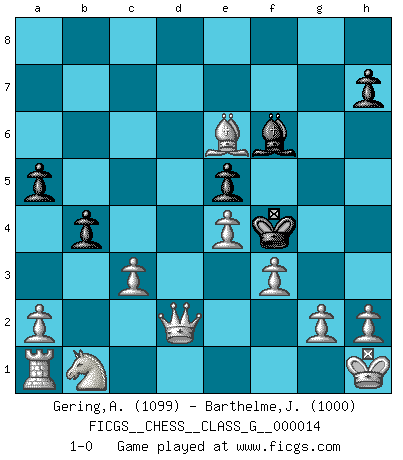 Last move : 1-0 2007 May 16 20:15:48 [Event "FICGS__CHESS__CLASS_G__000014"] [Site "FICGS"] [Date "2007.04.27"] [Round "1"] [White "Gering,Adrien"] [Black "Barthelme,Jean Eudes"] [Result "1-0"] [WhiteElo "1099"] [BlackElo "1000"] 1.e4 e5 2.Nf3 Nc6 3.Bc4 Bc5 4.b4 Bxb4 5.c3 Ba5 6.d4 d6 7.O-O Bg4 8.Qb3 Rb8 9.Bxf7+ Kf8 10.dxe5 Nxe5 11.Nxe5 dxe5 12.Ba3+ Ne7 13.f3 Bb6+ 14.Kh1 Bd7 15.Rd1 c5 16.Be6 a5 17.Rxd7 c4 18.Rxd8+ Bxd8 19.Qxc4 b5 20.Bxe7+ Kxe7 21.Qc6 Rb6 22.Qd7+ Kf6 23.Qf7+ Kg5 24.Qxg7+ Kf4 25.Qxh8 Rd6 26.Qf8+ Bf6 27.Qxd6 b4 28.Qd2+ 1-0 Evans gambit Kingside Castling by player White (move 7) Player White won this chess game. Follow this game move after move (download)I'd rather have a Pawn than a finger. (Reuben Fine) Nie in meinem Leben habe ich die französische Verteidigung gespielt, welche die Stumpfsinnigste von allen ist. (Wilhelm Steinitz) El jugador blanco perdió porque fallo en recordar la coreccta continuación y tuvo que pensar por sí mismo las movidas. (Siegbert Tarrasch) Le jeu d'échecs fait naître et fortifie en nous plusieurs qualités précieuses dans le cours de l'existence, telles que la prévoyance, la circonspection, la prudence, et la persévérance. (Benjamin Franklin - 1783, la morale des échecs) I can't decide which is riskier; taking crazy risks, or taking advice on crazy risks from a crazy risk taker. (Gregory House in House M.D.)