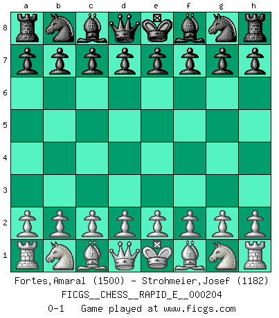 Last move : 0-1 2018 April 4 8:3:31 [Event "FICGS__CHESS__RAPID_E__000204"] [Site "FICGS"] [Date "2018.03.04"] [Round "1"] [White "Fortes,Amaral"] [Black "Strohmeier,Josef"] [Result "0-1"] [WhiteElo "1500"] [BlackElo "1182"] 0-1 This chess game has been lost on time (started : 2018.03.04 22:27:20) Player Black won this chess game. Follow this game move after move (download)A bad day of Chess is better than any good day at work. (Anonymous) Sitze auf Deine Hände. (Siegbert Tarrasch) No hay precio que no valga la pena por la cabellera del Rey enemigo. (Koblentz) Les échecs, c'est la lutte contre l'erreur. (Johannes Zukertort) The smarter you play, the luckier you'll be. (Mark Pilarski)