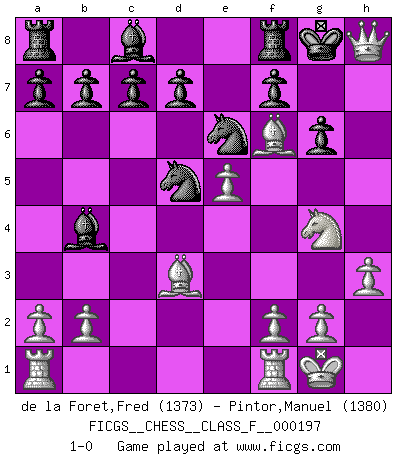 Last move : 1-0 2018 April 10 20:6:30 [Event "FICGS__CHESS__CLASS_F__000197"] [Site "FICGS"] [Date "2018.03.04"] [Round "1"] [White "de la Foret,Fred"] [Black "Pintor,Manuel"] [Result "1-0"] [WhiteElo "1373"] [BlackElo "1380"] 1.e4 e5 2.Nf3 Nc6 3.Bb5 Qf6 4.c3 Bc5 5.d4 exd4 6.e5 Qg6 7.cxd4 Bb4+ 8.Nc3 Nge7 9.O-O O-O 10.d5 Nd8 11.Bd3 Qh5 12.Ne2 Nxd5 13.Ng3 Qg4 14.Bxh7+ Kh8 15.Bf5 Qc4 16.Bd3 Qg4 17.h3 Qe6 18.Ng5 Qh6 19.Nf5 Qxg5 20.Bxg5 g6 21.Qg4 Ne6 22.Qh4+ Kg8 23.Nh6+ Kg7 24.Bf6+ Kh7 25.Ng4 Kg8 26.Qh8+ 1-0 Ruy Lopez (Spanish Opening) Kingside Castling by player White (move 9) Kingside Castling by player Black (move 9) Player White won this chess game. Follow this game move after move (download)Nothing excites jaded Grandmasters more than a theoretical novelty. (Dominic Lawson) Das Schach hält seine Meister in eigenen Banden, Fesseln; auf vielerlei Weise formt es ihren Geist, so dass die innere Freiheit selbst des Stärksten beeinflusst wird. (Albert Einstein) Si pudieramos observar el interior de la cabeza de un jugador de Ajedrez, encontraríamos ahí un mundo lleno de sentimientos, imágenes, ideas, emoción y pasión. (Alfred Binet) Il n'y a pas de prix trop élevé au scalp de l'ennemi. (Koblentz) We're missing something. (Gregory House, House M.D.)