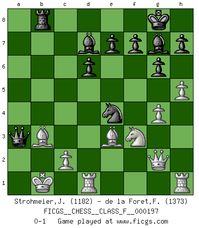Last move : 0-1 2018 June 9 20:53:40 [Event "FICGS__CHESS__CLASS_F__000197"] [Site "FICGS"] [Date "2018.03.04"] [Round "1"] [White "Strohmeier,Josef"] [Black "de la Foret,Fred"] [Result "0-1"] [WhiteElo "1182"] [BlackElo "1373"] 1.e4 c5 2.Nf3 d6 3.d4 cxd4 4.Nxd4 Nf6 5.Nc3 g6 6.f3 Bg7 7.Bc4 Nc6 8.Be3 O-O 9.Qd2 Ne5 10.Bb3 Rb8 11.O-O-O Bd7 12.g4 b5 13.a3 a5 14.h4 a4 15.Ba2 b4 16.axb4 Rxb4 17.h5 a3 18.bxa3 Nxf3 19.Nxf3 Qa8 20.Nb1 Rxb1+ 21.Kxb1 Nxe4 22.Qg2 Rb8+ 23.Bb3 Qxa3 0-1 Sicilian : Dragon variation Kingside Castling by player Black (move 8) Queenside Castling by player White (move 11) Player Black won this chess game. Follow this game move after move (download)Chess books should be used as we use glasses: to assist the sight, although some players make use of them as if they thought they conferred sight. (Jose Raul Capablanca) Wenn Du einsam bist, wenn Du Dich in der Welt wie ein Fremder fühlst, spiele Schach. Das wird Deinen Geist erheben und Dein Ratgeber im Kampf sein. (Aristoteles) Siempre es mucho mejor sacrificar las piezas de tu oponente. (Savielly Tartakover) Les échecs sont plus proches de l'art de l'assassinat que de l'art de la guerre. (Arturo Perez-Reverte) Now the reason the enlightened prince and the wise general conquer the enemy whenever they move and their achievements surpass those of ordinary men is foreknowledge. (Sun Tzu)