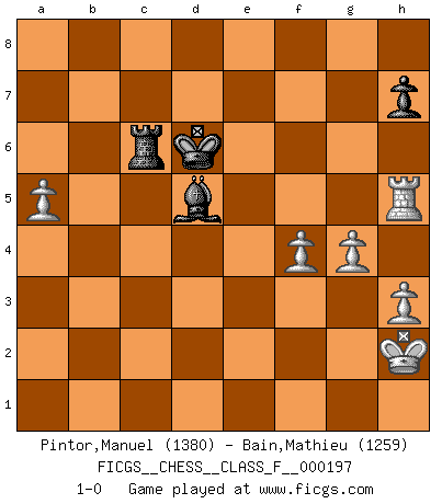 Last move : 1-0 2018 June 4 1:2:54 [Event "FICGS__CHESS__CLASS_F__000197"] [Site "FICGS"] [Date "2018.03.04"] [Round "1"] [White "Pintor,Manuel"] [Black "Bain,Mathieu"] [Result "1-0"] [WhiteElo "1380"] [BlackElo "1259"] 1.e4 e6 2.f4 d5 3.exd5 exd5 4.d4 c5 5.Bb5+ Nc6 6.Nf3 Bd7 7.O-O cxd4 8.Bxc6 Bxc6 9.Re1+ Be7 10.Nxd4 Qb6 11.Kh1 O-O-O 12.Qg4+ Bd7 13.Qxg7 Bf6 14.Qxf7 Qxd4 15.Nc3 Qf2 16.Be3 Qxc2 17.Re2 Qf5 18.Nxd5 Bxb2 19.Qxf5 Bxf5 20.Rxb2 Rxd5 21.Bxa7 Nf6 22.Rc1+ Kd7 23.Rxb7+ Ke6 24.Rc6+ Rd6 25.Rxd6+ Kxd6 26.Bd4 Rc8 27.h3 Ne4 28.Rb5 Ng3+ 29.Kh2 Ne2 30.Be5+ Ke6 31.a4 Be4 32.Rb6+ Rc6 33.Rb2 Nc1 34.a5 Nd3 35.Re2 Bd5 36.g4 Nxe5 37.Rxe5+ Kd6 38.Rh5 1-0 French : Labourdonnais variation Kingside Castling by player White (move 7) Queenside Castling by player Black (move 11) 10 pieces endgame at move 37 : White KRPPPP , Black KRBP WHITE : King + 1 Rook 4 Pawns BLACK : King + 1 Rook 1 Bishop 1 Pawn Player White won this chess game. Follow this game move after move (download)Pawns are born free, yet they are everywhere in chains. (Rick Kennedy) Obwohl ich vom Stil her kaum zu den Priestern der Schachkunst gezählt werde, halte ich Schach doch für eine Kunst. (Tigran Petrosjan) Aquellos que dicen que entienden al Ajedrez, no entienden nada. (Robert Hubner) A chaque perte on perd un peu de soi. (Joël Lautier) I have opinions of my own - strong opinions - but I don't always agree with them. (George Bush)