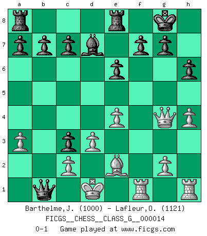 Last move : 0-1 2007 May 19 19:29:54 [Event "FICGS__CHESS__CLASS_G__000014"] [Site "FICGS"] [Date "2007.04.27"] [Round "1"] [White "Barthelme,Jean Eudes"] [Black "Lafleur,Olivier"] [Result "0-1"] [WhiteElo "1000"] [BlackElo "1121"] 1.e4 d5 2.d3 Nf6 3.Nc3 e6 4.Bf4 Bb4 5.Nf3 O-O 6.Bg5 Re8 7.Ne5 Nc6 8.f4 d4 9.a3 Bxc3+ 10.bxc3 dxc3 11.h4 h6 12.Bxf6 Qxf6 13.Qg4 Nxe5 14.fxe5 Qxe5 15.Be2 Bd7 16.O-O-O Qb5 17.Rdf1 Qb2+ 18.Kd1 Qb1+ 0-1 Scandinavian (centre counter) defense Kingside Castling by player Black (move 5) Queenside Castling by player White (move 16) Player Black won this chess game. Follow this game move after move (download)Chess is imagination. (David Bronstein) Ich rechne überhaupt nicht voraus. Ich gewinne auch so. (Robert James Fischer) A través de las casillas del tablero, los Indios explican el movimiento del tiempo y la edad, las influencias mas altas que controlan el mundo y los lazos que vinculan al Ajedrez con el alma humana. (Al-Masudi) Aucun coup ne doit être joué sans but. (Pedro Damiano) Mac users swear by their computers. PC users swear at their computers. (Author unknown)