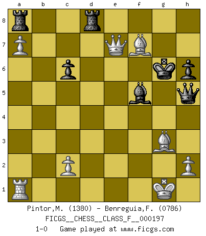 Last move : 1-0 2018 March 14 19:11:20 [Event "FICGS__CHESS__CLASS_F__000197"] [Site "FICGS"] [Date "2018.03.04"] [Round "1"] [White "Pintor,Manuel"] [Black "Benreguia,Frederic"] [Result "1-0"] [WhiteElo "1380"] [BlackElo "0786"] 1.e4 e5 2.f4 Qh4+ 3.g3 Qf6 4.fxe5 Qxe5 5.Nc3 Nf6 6.Nf3 Qh5 7.d4 Bb4 8.e5 Nd5 9.Bd2 Bxc3 10.bxc3 d6 11.Bc4 Nb6 12.Bb3 d5 13.O-O Bg4 14.a4 O-O 15.Qe2 Re8 16.Qf2 N8d7 17.Ng5 Rf8 18.Qg2 h6 19.Nf3 c6 20.a5 Bh3 21.Qf2 Bxf1 22.axb6 Bh3 23.bxa7 Bg4 24.Nh4 f6 25.Bf4 fxe5 26.dxe5 Nxe5 27.Qd4 g5 28.Bxe5 gxh4 29.c4 hxg3 30.Bxg3 Kh7 31.cxd5 Rfd8 32.Qe4+ Bf5 33.Qe7+ Kg6 34.dxc6 bxc6 35.Bf7+ 1-0 King's gambit Kingside Castling by player White (move 13) Kingside Castling by player Black (move 14) Player White won this chess game. Follow this game move after move (download)Daring ideas are like Chess men moved forward. They may be beaten, but they may start a winning game. (Johann Wolfgang von Goethe) Nur ein wirklich starker Spieler weiß wie schwach er spielt. (Savielly Grigorievitsch Tartakower) El jugador táctico debe saber que hacer cuando algo se debe de hacer. El estratégico debe saber que hacer cuando nada se debe de hacer. (Savielly Tartakover) Je ne suis pas le dernier à jouer lâchement des coups douteux pendant le zeïtnot de l'adversaire pour l'achever: en effet les coups qui font le plus peur sont ceux que l'on ne comprend pas. Je me fais souvent peur quand je joue. (Un professeur anonyme) Live, lose, and learn, by observing your opponent how to win. (Amber Steenbock)