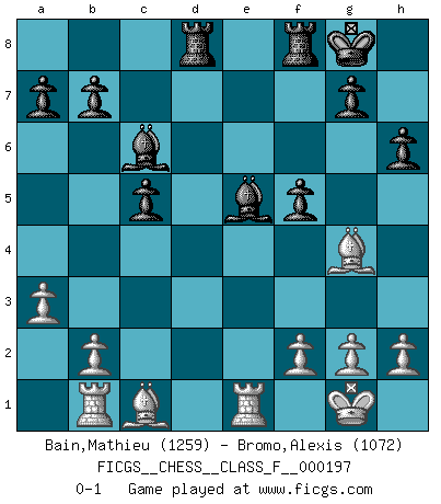 Last move : 0-1 2018 June 23 15:55:6 [Event "FICGS__CHESS__CLASS_F__000197"] [Site "FICGS"] [Date "2018.03.04"] [Round "1"] [White "Bain,Mathieu"] [Black "Bromo,Alexis"] [Result "0-1"] [WhiteElo "1259"] [BlackElo "1072"] 1.d4 d5 2.c4 e6 3.Nc3 h6 4.e4 dxe4 5.Nxe4 Nf6 6.Nxf6+ Qxf6 7.a3 c5 8.d5 Bd6 9.dxe6 Qxe6+ 10.Be2 O-O 11.Nf3 Nc6 12.O-O Bd7 13.Re1 Ne5 14.Nxe5 Bxe5 15.Bd3 f6 16.Qh5 Be8 17.Qf3 Bc6 18.Bf5 Qxc4 19.Qg4 Qxg4 20.Bxg4 Rad8 21.Rb1 f5 0-1 QGD : 3.Nc3 Kingside Castling by player Black (move 10) Kingside Castling by player White (move 12) Player Black won this chess game. Follow this game move after move (download)Good offense and good defense both begin with good development. (Bruce A. Moon) Obendrein hat der FIDE-Präsident den Revolutionsführer Gaddafi zum »Großmeister« ernannt, am Ende der WM. Das ist lächerlich! (Joel Lautier) La belleza de un movimiento no se refleja solo en su apariencia, sino en el pensamiento detrás de él. (Siegbert Tarrasch) On est toujours la mazette de quelqu'un d'autre. (Anonyme) Luck never made a man wise. (Seneca, Letters to Lucilius)