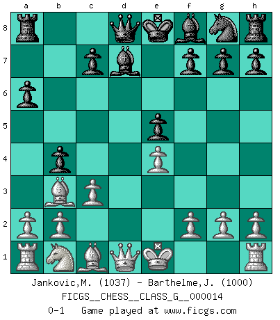Last move : 0-1 2007 June 16 19:52:30 [Event "FICGS__CHESS__CLASS_G__000014"] [Site "FICGS"] [Date "2007.04.27"] [Round "1"] [White "Jankovic,Mladen"] [Black "Barthelme,Jean Eudes"] [Result "0-1"] [WhiteElo "1037"] [BlackElo "1000"] 1.e4 e5 2.Nf3 Nc6 3.Bb5 d6 4.d4 Bd7 5.c3 a6 6.Ba4 b5 7.Bb3 b4 8.dxe5 Nxe5 9.Nxe5 dxe5 0-1 This chess game has been lost on time (started : 2007.04.27 20:7:9) Ruy Lopez : Old Steinitz defense Player Black won this chess game. Follow this game move after move (download)Good positions don't win games, good moves do. (Gerald Abrahams) Ich würde die 30 stärksten Spieler der USA im Simultanspiel besiegen. (José Raúl Capablanca) Un mal plan es mejor que no tener ningún plan. (Frank Marshall) Il vaut mieux sacrifier les pièces de l'adversaire. (Xavier Tartacover) The meaning of life is that it is to be lived, and it is not to be traded and conceptualized and squeezed into a pattern of systems. (Bruce Lee)
