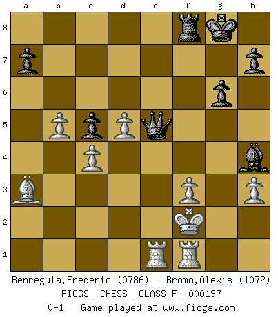 Last move : 0-1 2018 March 9 17:38:21 [Event "FICGS__CHESS__CLASS_F__000197"] [Site "FICGS"] [Date "2018.03.04"] [Round "1"] [White "Benreguia,Frederic"] [Black "Bromo,Alexis"] [Result "0-1"] [WhiteElo "0786"] [BlackElo "1072"] 1.e4 e5 2.d4 f6 3.d5 d6 4.Nf3 Be7 5.c4 Nh6 6.b4 b6 7.Nc3 O-O 8.a4 Nd7 9.Be2 Bb7 10.Ba3 f5 11.Qc2 fxe4 12.Qxe4 Nf6 13.Qd3 c5 14.bxc5 bxc5 15.O-O Ba6 16.Nb5 Bxb5 17.axb5 g6 18.Bd1 Nf5 19.g4 e4 20.Qc3 Nxg4 21.h3 Ne5 22.Nxe5 dxe5 23.Bg4 Qd6 24.Rae1 e3 25.Bxf5 Rxf5 26.Qxe3 Raf8 27.f3 Rg5+ 28.Kf2 e4 29.Qxe4 Qh2+ 30.Ke3 Re5 31.Qxe5 Qxe5+ 32.Kf2 Bh4+ 0-1 King's pawn game Kingside Castling by player Black (move 7) Kingside Castling by player White (move 15) Player Black won this chess game. Follow this game move after move (download)First-class players lose to second class players because second-class players sometimes play a first-class game. (Tarrasch) Ivan Sokolov treibt mich als Beifahrer an mit go Loeky go - . (Loek van Wely) Personalmente, yo prefiero mirar hacia el futuro en donde un programa de computadora gane el título mundial de Ajedrez. La humanidad necesita una lección de humildad. (Richard Dawkings) Les Echecs sont et restent toujours un combat, un combat intégral comme la boxe, la lutte ou un autre sport, et où il doit y avoir un vainqueur et un vaincu. (Joseph Emil Diemer) The production of too many useful things results in too many useless people. (Karl Marx)