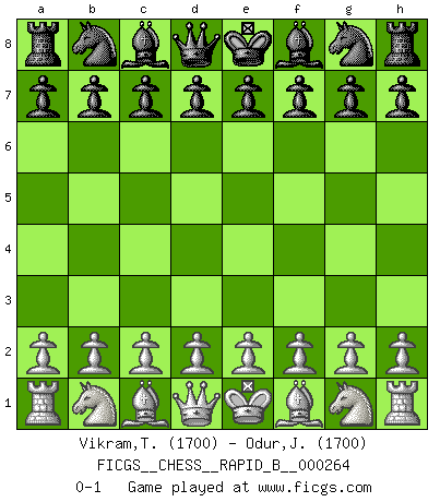 Last move : 0-1 2018 May 6 10:40:8 [Event "FICGS__CHESS__RAPID_B__000264"] [Site "FICGS"] [Date "2018.04.06"] [Round "1"] [White "Vikram,Tajendra"] [Black "Odur,James Walter"] [Result "0-1"] [WhiteElo "1700"] [BlackElo "1700"] 0-1 This chess game has been lost on time (started : 2018.04.06 2:30:45) Player Black won this chess game. Follow this game move after move (download)Bobby Fischer is the greatest Chess player who has ever lived. (Ken Smith) Das Schachspiel hat wie die Liebe, die Musik, die Fähigkeit, den Menschen glücklich zu machen. Ich habe ein leises Gefühl des Bedauerns für jeden, der das Schachspiel nicht kennt, so wie ich jeden bedaure, der die Liebe nicht kennt. (Siegbert Tarrasch) Coloca el contenido del tablero de Ajedrez en un sombrero, agita las piezas vigorosamente, derrámalas en el tablero desde una altura de medio metro y así obtienes el estilo de Wilhelm Steinitz. (H. E. Bird) On n'a jamais que l'âge auquel on a commence à jouer aux échecs car après on cesse de vieillir. (Capablanca) Real knowledge is to know the extent of one's ignorance. (Confucius)