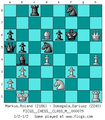 Last move : 1/2-1/2 2018 April 28 18:3:41 [Event "FICGS__CHESS__CLASS_M__000079"] [Site "FICGS"] [Date "2018.03.06"] [Round "1"] [White "Markus,Roland"] [Black "Domagala,Dariusz"] [Result "1/2-1/2"] [WhiteElo "2186"] [BlackElo "2240"] 1.Nc3 d5 2.d4 Nf6 3.Bf4 Bf5 4.f3 e6 5.g4 Bg6 6.h4 h5 7.g5 Nfd7 8.e3 a6 9.Bd3 Bxd3 10.Qxd3 c5 11.Nge2 Nc6 12.O-O-O Qa5 13.g6 c4 14.Qd2 b5 15.gxf7+ Kxf7 16.b3 Rc8 17.Kb1 Bb4 18.e4 Ne7 19.Rc1 Ba3 20.Rcg1 Bb4 21.Qe3 cxb3 22.cxb3 Bxc3 23.exd5 Nf8 24.Rxg7+ Kxg7 25.Qe5+ Kf7 26.Qxh8 Nxd5 27.Bd6 Bb4 28.Qxh5+ Kf6 29.Qh6+ 1/2-1/2 Dunst (Sleipner, Heinrichsen) Opening Queenside Castling by player White (move 12) This chess game ended in a draw. Follow this game move after move (download)Chess is like life. (Boris Spassky) Das Zentrum ist der Balkan des Schachbretts - Kriegshandlungen können in jedem Moment ausbrechen. (Aaron Nimzowitsch) El hombre es un frívolo, una creatura engañosa y como un jugador de Ajedrez, se preocupa mas por el proceso de obtener su meta que de la meta por sí misma. (Dostoyevsky) La menace est plus forte que l'exécution. (Aaron Nimzovitch) If I had no sense of humor, I would long ago have committed suicide. (Mahatma Gandhi)