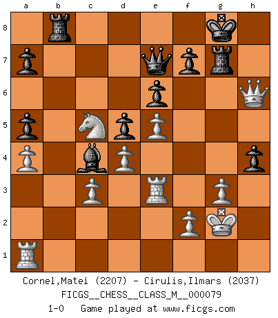 Last move : 1-0 2018 July 4 16:6:19 [Event "FICGS__CHESS__CLASS_M__000079"] [Site "FICGS"] [Date "2018.03.06"] [Round "1"] [White "Cornel,Matei"] [Black "Cirulis,Ilmars"] [Result "1-0"] [WhiteElo "2207"] [BlackElo "2037"] 1.d4 e6 2.e4 d5 3.Nc3 Bb4 4.e5 Ne7 5.a3 Bxc3+ 6.bxc3 c5 7.Qg4 Kf8 8.a4 Nbc6 9.Qd1 Qa5 10.Bd2 Qc7 11.Nf3 b6 12.Be2 Kg8 13.O-O Na5 14.Bc1 Bb7 15.Re1 Rd8 16.Nd2 cxd4 17.cxd4 Qc3 18.Ba3 Nec6 19.Nf3 h6 20.Bd6 Nc4 21.Bxc4 Qxc4 22.c3 Na5 23.Bb4 Ba6 24.Re3 Qc7 25.Bxa5 bxa5 26.Nd2 Rb8 27.h4 Qe7 28.g3 g5 29.Nb3 gxh4 30.Nc5 Bc4 31.Kg2 Rh7 32.Qh5 Rg7 33.Qxh6 1-0 Queen's pawn Kingside Castling by player White (move 13) Player White won this chess game. Follow this game move after move (download)We must make sure that Chess will not be like a dead language, very interesting, but for a very small group. (Sytze Faber) Der 70jährige Viktor Kortschnoi: Die Rentenanstalt wollte mich zwingen in Rente zu gehen. Meine Frau erhält jetzt eine Pension- und ich zahle weiter in die Rentenkasse ein! (Viktor Kortschnoi) En un gambito tu regalas un Peón por el bién de tomar un juego perdido. (Samuel Standige Boden) Le plus grand jeu de l'esprit jamais inventé, plus vous l'apprenez, plus vous y prenez du plaisir. (Garry Kasparov) Games, world of games... There's always an opponent, and there's always a victim. (Revolver, movie)