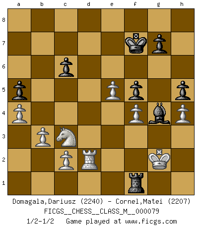 Last move : 1/2-1/2 2018 September 17 14:20:35 [Event "FICGS__CHESS__CLASS_M__000079"] [Site "FICGS"] [Date "2018.03.06"] [Round "1"] [White "Domagala,Dariusz"] [Black "Cornel,Matei"] [Result "1/2-1/2"] [WhiteElo "2240"] [BlackElo "2207"] 1.e4 e5 2.Nc3 Nc6 3.g3 Nf6 4.Bg2 Bc5 5.Nge2 d6 6.Na4 h5 7.h4 a6 8.Nxc5 dxc5 9.d3 Qd6 10.f3 Be6 11.Be3 a5 12.O-O O-O 13.a4 Nd4 14.b3 b6 15.Qd2 Rab8 16.Rae1 c6 17.Kh1 Qc7 18.Bg1 Nd7 19.f4 Bg4 20.Nc3 exf4 21.gxf4 Qd8 22.Bf2 Nf3 23.Bxf3 Bxf3+ 24.Kh2 f5 25.e5 Re8 26.d4 cxd4 27.Qxd4 Kh7 28.Qd3 Bg4 29.Rd1 Nc5 30.Qxd8 Rbxd8 31.Rxd8 Rxd8 32.Be3 Kg8 33.Rf2 Kf7 34.Bxc5 bxc5 35.Nb1 c4 36.Nd2 c3 37.Nb1 Rd1 38.Nxc3 Re1 39.Rd2 Rf1 40.Kg2 1/2-1/2 Dariusz Domagala Good game! Thank you very much :-) Vienna : Paulsen variation Kingside Castling by player White (move 12) Kingside Castling by player Black (move 12) This chess game ended in a draw. Follow this game move after move (download)Chess is a beautiful mistress. (Bent Larsen) Im Hotelzimmer gab es nur zwei Schaben. (Über die Turnierbedingungen) (Peter Swidler) Un buen jugador siempre tiene buena suerte. (José Raúl Capablanca) Les ravages du H expliquent la différence de niveau entre Tal et Thal [Abergel]. I'm extremely disappointed. I send you out for exciting, new designer drugs, you come back with tomato sauce. (Gregory House, House M.D.)