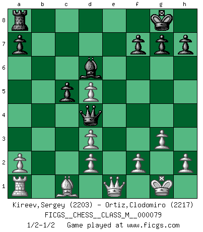 Last move : 1/2-1/2 2018 March 13 14:20:19 [Event "FICGS__CHESS__CLASS_M__000079"] [Site "FICGS"] [Date "2018.03.06"] [Round "1"] [White "Kireev,Sergey"] [Black "Ortiz,Clodomiro"] [Result "1/2-1/2"] [WhiteElo "2203"] [BlackElo "2217"] 1.e4 e5 2.Nf3 Nc6 3.Bc4 Nf6 4.Ng5 d5 5.exd5 Na5 6.Bb5+ c6 7.dxc6 bxc6 8.Bd3 Nd5 9.Nf3 Bd6 10.O-O Nf4 11.Re1 Nxd3 12.cxd3 O-O 13.Nxe5 c5 14.Nc3 Bb7 15.b3 Re8 16.Nc4 Rxe1+ 17.Qxe1 Nxc4 18.bxc4 Qg5 19.g3 Qg4 20.Nd5 Bxd5 21.cxd5 Qd4 1/2-1/2 Two knights defense Kingside Castling by player White (move 10) Kingside Castling by player Black (move 12) This chess game ended in a draw. Follow this game move after move (download)Let the perfectionist play postal. (Yasser Seirawan) Wer wird heute Abend ihr Gegner sein? -- Heute Abend spiele ich gegen die schwarzen Steine. (Akiba Rubinstein) Yo jugué Ajedrez con el y a veces le pude haber ganado solo que siempre devuelve su última jugada y juega la partida de manera diferente. (Mark Twain) Une platitude souvent récitée à propos des Echecs est qu'une des choses les plus difficiles à réaliser est de gagner une position gagnante. Cela ne manque pas de sens mais, pour ma part, j'ai toujours trouvé plus difficile de gagner une position perdante. (Tim Krabbe) A good book on your shelf is a friend that turns its back on you and remains a friend. (Author unknown)