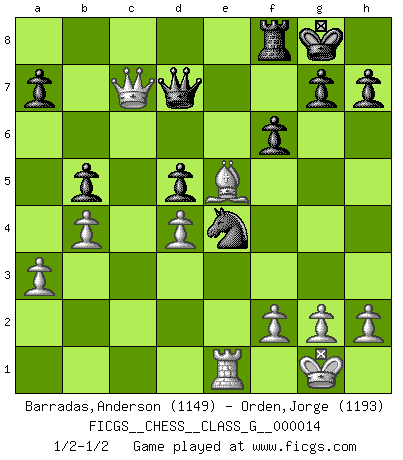 Last move : 1/2-1/2 2007 May 11 18:42:54 [Event "FICGS__CHESS__CLASS_G__000014"] [Site "FICGS"] [Date "2007.04.27"] [Round "1"] [White "Barradas,Anderson"] [Black "Orden,Jorge"] [Result "1/2-1/2"] [WhiteElo "1149"] [BlackElo "1193"] 1.d4 d5 2.c4 e6 3.Nf3 c5 4.e3 Nf6 5.cxd5 Nxd5 6.Bb5+ Bd7 7.Bxd7+ Nxd7 8.O-O Be7 9.Nc3 cxd4 10.exd4 O-O 11.Nxd5 exd5 12.a3 Nf6 13.b4 b5 14.Ne5 Qc7 15.Bd2 Bd6 16.Rc1 Qe7 17.Re1 Ne4 18.Bf4 Rac8 19.Nc6 Qd7 20.Ne5 Bxe5 21.Bxe5 Rxc1 22.Qxc1 f6 23.Qc7 1/2-1/2 Queen's gambit declined Kingside Castling by player White (move 8) Kingside Castling by player Black (move 10) This chess game ended in a draw. Follow this game move after move (download)If your opponent cannot do anything active, then don't rush the position; instead you should let him sit there, suffer, and beg you for a draw. (Jeremy Silman) Meine Liebe ist Schach, Schach, Schach. Ich muss jeden Tag Schach spielen, deshalb fühle ich mich so stark. (Miguel Najdorf) No soy una persona materialista y por eso, no resiento la falta o pérdida del dinero. La ausencia de cosas mundanas carece de importancia. Ya que el Ajedrez es una forma en la que puedo ser tan materialista como yo desee sin tener la necesidad de vender mi alma. (Jamie Walter Adams) L'attaque fait le spectacle, la défense gagne les matchs. (Dicton footballistique) Industry executives and analysts often mistakenly talk about strategy as if it were some kind of chess match. But in chess, you have just two opponents, each with identical resources, and with luck playing a minimal role. The real world is much more like a poker game, with multiple players trying to make the best of whatever hand fortune has dealt them. In our industry, Bill Gates owns the table until someone proves otherwise. (David Moschella, 'Computerworld')