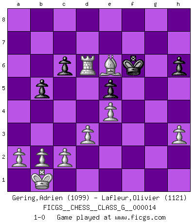 Last move : 1-0 2007 May 18 14:39:47 [Event "FICGS__CHESS__CLASS_G__000014"] [Site "FICGS"] [Date "2007.04.27"] [Round "1"] [White "Gering,Adrien"] [Black "Lafleur,Olivier"] [Result "1-0"] [WhiteElo "1099"] [BlackElo "1121"] 1.e4 e5 2.Nf3 Nc6 3.Bc4 d6 4.Nc3 Nf6 5.d3 Bg4 6.Bg5 Nd4 7.h3 Bxf3 8.gxf3 Nxf3+ 9.Qxf3 h6 10.Bxf6 Qxf6 11.Qxf6 gxf6 12.Nd5 O-O-O 13.Nxf6 Be7 14.Nd5 Bh4 15.O-O-O Rhg8 16.Rhg1 Bxf2 17.Rxg8 Rxg8 18.Ne7+ Kd8 19.Nxg8 Be3+ 20.Kb1 Ke8 21.Rf1 Kf8 22.Rxf7+ Kxg8 23.Rf3 Kg7 24.Rxe3 Kg6 25.Rg3+ Kh5 26.Rg4 c6 27.Rg7 Kh4 28.Be6 b5 29.Rxa7 Kg5 30.Rd7 Kf6 31.Rxd6 1-0 King's pawn game Queenside Castling by player Black (move 12) Queenside Castling by player White (move 15) Player White won this chess game. Follow this game move after move (download)I'm not afraid of Spassky. The world knows I'm the best. You don't need a match to prove it. (Bobby Fischer) Ohne Fehler kann es keine Brillanz geben. (Emanuel Lasker) Aunque la mayoría de la gente disfruta observar las partidas de los grandes Maestros de ataque, algunos de los jugadores mas notables en la historia han sido los jugadores silenciosos posicionales. Lentamente ellos te aplastan despojandote de tu espacio, congestionando tus piezas y dejandote virtualmente sin nada que hacer. (Yasser Seirawan) Avant la finale, les dieux ont créé le milieu de partie. (Tarrasch) This is where the fun begins. (Anakin Skywalker in Star Wars ep.3)