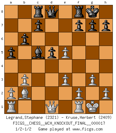 Last move : 1/2-1/2 2018 April 14 11:24:13 [Event "FICGS__CHESS__WCH_KNOCKOUT_FINAL__000017"] [Site "FICGS"] [Date "2018.03.07"] [Round "2"] [White "Legrand,Stephane"] [Black "Kruse,Herbert"] [Result "1/2-1/2"] [WhiteElo "2321"] [BlackElo "2409"] 1.d4 Nf6 2.c4 e6 3.g3 d5 4.Bg2 Bb4+ 5.Nd2 O-O 6.Ngf3 b6 7.O-O Bb7 8.b3 Nbd7 9.Bb2 Rc8 10.e3 a5 11.Ne5 Nxe5 12.dxe5 Nd7 13.cxd5 Bxd5 14.Ne4 Nc5 15.Nxc5 Bxc5 16.Bxd5 exd5 1/2-1/2 Catalan : Closed Kingside Castling by player Black (move 5) Kingside Castling by player White (move 7) This chess game ended in a draw. Follow this game move after move (download)A good player is always lucky. (Jose Raul Capablanca) Ein Schachgenie ist jemand der verdammt gut Schach spielt. (Jonathan Levitt) En el Ajedrez, tal como es jugado por los Maestros, practicamente la suerte es eliminada. (Emanuel Lasker) Les échecs sont un jeu par leur forme, un art par leur essence et une science par sa difficulté d'acquisition. Ils peuvent vous procurer autant de plaisir qu'un bon livre ou une belle musique, mais vous n'aurez une réelle joie que si vous arrivez à bien jouer. (Tigran Petrosian) The age of a woman doesn't mean a thing. The best tunes are played on the oldest fiddles. (Ralph Waldo Emerson)