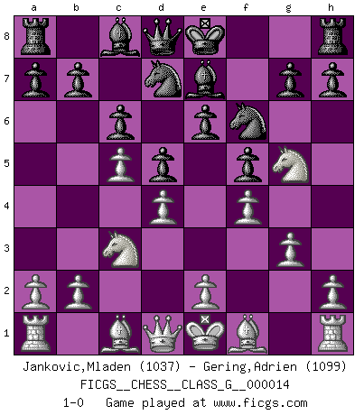 Last move : 1-0 2007 July 14 16:59:40 [Event "FICGS__CHESS__CLASS_G__000014"] [Site "FICGS"] [Date "2007.04.27"] [Round "1"] [White "Jankovic,Mladen"] [Black "Gering,Adrien"] [Result "1-0"] [WhiteElo "1037"] [BlackElo "1099"] 1.d4 d5 2.c4 e6 3.Nc3 c6 4.c5 f5 5.f4 Nf6 6.g3 Be7 7.Nf3 Nbd7 8.Ng5 1-0 This chess game has been lost on time (started : 2007.04.27 20:7:9) QGD : Semi-Slav Player White won this chess game. Follow this game move after move (download)The beauty of a move lies not in its' appearance but in the thought behind it. (Siegbert Tarrasch) Auf jeden Fall musst du zuerst Rechtsanwalt werden, damit du deine eigenen Interessen und die deiner Familie vertreten kannst. [Brief an seinen Sohn] (José Raúl Capablanca) El Ajedrez es imaginación. (David Bronstein) Seul un grand joueur sait à quel point il joue faiblement. (Xavier Tartacover) A belief is an idea the mind possesses, an idea that possesses the mind. (Robert Oxden Bolton)