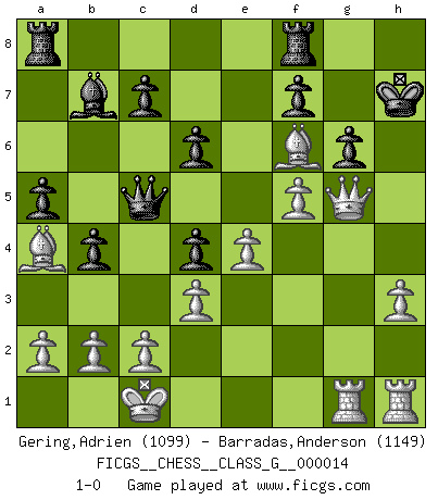 Last move : 1-0 2007 May 2 21:44:45 [Event "FICGS__CHESS__CLASS_G__000014"] [Site "FICGS"] [Date "2007.04.27"] [Round "1"] [White "Gering,Adrien"] [Black "Barradas,Anderson"] [Result "1-0"] [WhiteElo "1099"] [BlackElo "1149"] 1.e4 e5 2.Nf3 Nc6 3.Bc4 h6 4.Nc3 Nf6 5.d3 Bb4 6.Be3 d6 7.Qd2 Bxc3 8.Qxc3 O-O 9.O-O-O a6 10.h3 b5 11.Bb3 Bb7 12.g4 b4 13.Qd2 a5 14.Ba4 Qd7 15.g5 hxg5 16.Bxg5 Qe6 17.Bb3 Qe7 18.Ba4 Nd4 19.Nxd4 exd4 20.Rdg1 Qe5 21.f4 Qc5 22.Bxf6 g6 23.f5 Kh7 24.Qg5 1-0 King's pawn game Kingside Castling by player Black (move 8) Queenside Castling by player White (move 9) Player White won this chess game. Follow this game move after move (download)Chess is no whit inferior to the violin, and we have a large number of professional violinists. (Mikhail Botvinnik) Das Schachspiel übertrifft alle anderen Spiele so weit wie der Chimborasso einen Misthaufen. (Arthur Schopenhauer) No es suficiente ser un buen jugador, se debe también de jugar bién. (Siegbert Tarrasch) Le thème de l'attaque double intervient d'une manière ou d'une autre dans l'immense majorité des combinaisons. (Youri Averbakh) Sometimes it pays to stay in bed in Monday, rather than spending the rest of the week debugging Monday's code. (Dan Salomon)