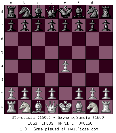 Last move : 1-0 2018 May 5 10:37:51 [Event "FICGS__CHESS__RAPID_C__000158"] [Site "FICGS"] [Date "2018.04.04"] [Round "1"] [White "Otero,Luis"] [Black "Gavhane,Sandip"] [Result "1-0"] [WhiteElo "1600"] [BlackElo "1600"] 1.e4 1-0 This chess game has been lost on time (started : 2018.04.04 19:19:7) King's pawn Opening Player White won this chess game. Follow this game move after move (download)The boy (then a 12 year old boy named Anatoly Karpov) doesn't have a clue about Chess, and there's no future at all for him in this profession. (Mikhail Botvinnik) Es gibt Leute, die glauben, alles wäre vernünftig, was man mit einem ernsthaften Gesicht tut. (Georg Christoph Lichtenberg) El pensamiento metódico es mas útil en el Ajedrez que la inspiración. (C. J. S. Purdy) Les Echecs ont trois composantes : le temps, l'espace et le matériel en dernier. (Mikhail Tal) Now be brave and don't look back. Don't look back. (Shmi Skywalker in Star Wars ep.1)