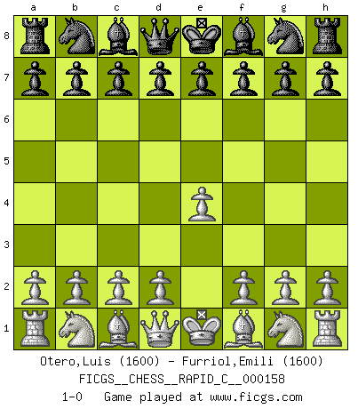Last move : 1-0 2018 May 5 10:37:51 [Event "FICGS__CHESS__RAPID_C__000158"] [Site "FICGS"] [Date "2018.04.04"] [Round "1"] [White "Otero,Luis"] [Black "Furriol,Emili"] [Result "1-0"] [WhiteElo "1600"] [BlackElo "1600"] 1.e4 1-0 This chess game has been lost on time (started : 2018.04.04 19:19:7) King's pawn Opening Player White won this chess game. Follow this game move after move (download)Becoming successful at Chess allows you to discover your own personality. That's what I want for the kids I teach. (Saudin Robovic) Intelligenz läßt sich nicht am Weg, sondern nur am Ergebnis feststellen. (Garry Kasparov) No nos podemos resistir a la fascinación de un sacrificio ya que la pasión por los sacrificios es parte de la naturaleza de un jugador de Ajedrez. (Rudolf Spielman) Il vaut toujours mieux jouer un plan faux de façon logique que de n'avoir pas de plan du tout. (Victor Kortchnoï) A cynic is a man who knows the price of everything but the value of nothing. (Oscar Wilde)