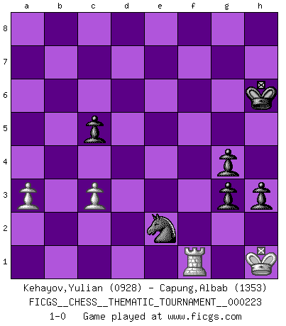 Last move : 1-0 2018 June 15 14:53:44 [Event "FICGS__CHESS__THEMATIC_TOURNAMENT__000223"] [Site "FICGS"] [Date "2018.03.09"] [Round "1"] [White "Kehayov,Yulian"] [Black "Capung,Albab"] [Result "1-0"] [WhiteElo "0928"] [BlackElo "1353"] 1.e4 c5 2.Nf3 a6 3.c4 e5 4.Be2 Nc6 5.O-O Nf6 6.a3 Nxe4 7.d3 Nf6 8.h3 d5 9.cxd5 Nxd5 10.Nc3 Nxc3 11.bxc3 h5 12.Nh4 Qxh4 13.Bf3 Bd6 14.Be3 Bxh3 15.gxh3 Qxh3 16.Bg2 Qh4 17.Qf3 e4 18.Qh3 Qxh3 19.Bxh3 exd3 20.Rfd1 Ne5 21.f4 Ng6 22.Rxd3 Bxf4 23.Bxf4 Nxf4 24.Re3+ Kf8 25.Bf1 Rd8 26.Bc4 g5 27.Rb1 b5 28.Bf1 g4 29.Bg2 h4 30.Rbe1 g3 31.Bb7 Rg8 32.Bxa6 h3 33.Bxb5 f5 34.Bc4 Rg4 35.Bb5 Rd2 36.Re8+ Kf7 37.Bc4+ Kf6 38.Rf8+ Kg7 39.Rg8+ Kh6 40.Rxg4 Rg2+ 41.Kh1 Rh2+ 42.Kg1 Rg2+ 43.Kh1 fxg4 44.Bf1 Rf2 45.Kg1 Rxf1+ 46.Rxf1 Ne2+ 47.Kh1 1-0 Sicilian : O'Kelly variation Kingside Castling by player White (move 5) 10 pieces endgame at move 46 : White KRPP , Black KNPPPP WHITE : King + 1 Rook 2 Pawns BLACK : King + 1 Knight 4 Pawns Player White won this chess game. Follow this game move after move (download)I prefer to lose a really good game than to win a bad one. (David Levy) Schach ist Krieg, im Schach geht es um testosterongesteuerte Urschreie. (Garry Kasparov) En el Ajedrez, cuando menos, el valiente hereda la tierra. (Edmar Mednis) Il a essayé de se convaincre qu'il pourrait empêcher toutes les erreurs et ne jamais perdre. L'horreur ! Gary Kasparov au sujet de Robert Fischer. If we don't succeed, we run the risk of failure. (George W. Bush)