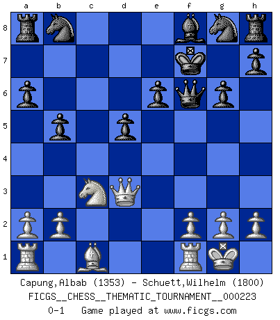 Last move : 0-1 2018 July 5 5:58:1 [Event "FICGS__CHESS__THEMATIC_TOURNAMENT__000223"] [Site "FICGS"] [Date "2018.03.09"] [Round "1"] [White "Capung,Albab"] [Black "Schuett,Wilhelm"] [Result "0-1"] [WhiteElo "1353"] [BlackElo "1800"] 1.e4 c5 2.Nf3 a6 3.Ne5 d6 4.Nxf7 Kxf7 5.Bc4+ e6 6.Qh5+ g6 7.Qf3+ Qf6 8.Qg3 b5 9.Bd3 Bb7 10.O-O c4 11.Be2 Bxe4 12.Nc3 Bxc2 13.d3 Bxd3 14.Bxd3 cxd3 15.Qxd3 d5 0-1 Sicilian : O'Kelly variation Kingside Castling by player White (move 10) Player Black won this chess game. Follow this game move after move (download)If your opponent cannot do anything active, then don't rush the position; instead you should let him sit there, suffer, and beg you for a draw. (Jeremy Silman) Mein Gehirn das ist mein zweitwichtigstes Organ [Aus dem Film: Der Schläfer]. (Woody Allen) No nos podemos resistir a la fascinación de un sacrificio ya que la pasión por los sacrificios es parte de la naturaleza de un jugador de Ajedrez. (Rudolf Spielman) Toutes les manuvres exécutées sur une colonne ouverte ont pour but ultime l'intrusion définitive sur la septième ou la huitième rangée, en plein cur de la position ennemie. (Aaron Nimzovitch) It is the aim of the modern school, not to treat every position according to one general law, but according to the principle inherent in the position. (Richard Reti)