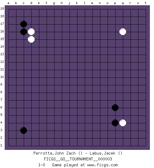Last move : 1-0 2006 August 9 5:2:24 [Event "FICGS__GO__TOURNAMENT__000003 "] [Site "FICGS"] [Date "2006.06.03"] [Round "1"] [Black "Perrotta,John Zach "] [White "Labus,Jacek "] [Result "1-0"] 1.c17 d16 2.p6 q4 3.c16 q16 4.c3 d15 5.p4 1-0 This go game has been lost on time (started : 2006.06.03 13:0:3) Here are the names of the openings (joseki) played in the four corners : Corner d16 : c17 d16San-San (Sam-Sam, San-San) 3-3 Point. The San-San (3-3) point, emphasizing territory at the expense of influence.Kata-tsuki (shoulder hit). The shoulder-hit is the traditional answer to the 3-3. The direction of Black 3 depends on the positions on the side. Crawling once may be the premise for a follow-up move of sliding with a knight's move in the opposite direction. If Black plays 3 at 3-4 (to the right), the follow-on knight's move is then played at the top (e.g. 3-4, 4-5, 5-2). Black's knight's move reduces territory potential on the side it is played. Corner q4 : p6 q4This joseki is unknown. A weak or weird move has probably been played in this corner. Player Black won this Go (weiqi, baduk) game.Follow this game move after move (download ) With only one group, you will win. (Anonymous) All art requires courage. (Anne Tucker)
