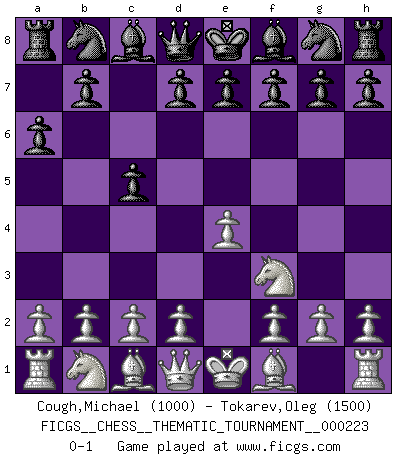 Last move : 0-1 2018 April 18 9:10:32 [Event "FICGS__CHESS__THEMATIC_TOURNAMENT__000223"] [Site "FICGS"] [Date "2018.03.09"] [Round "1"] [White "Cough,Michael"] [Black "Tokarev,Oleg"] [Result "0-1"] [WhiteElo "1000"] [BlackElo "1500"] 1.e4 c5 2.Nf3 a6 0-1 This chess game has been lost on time (started : 2018.03.09 3:4:42) Sicilian : O'Kelly variation Player Black won this chess game. Follow this game move after move (download)A great player and a great example for many. His book My 60 Memorable Games had a big impact on me. It is a shame he didn't continue to enrich the world of chess with his unparalleled understanding after 1972. (Jan Timman, about Bobby Fischer's death) Nach Morphy wurde nichts neues mehr in der Behandlung offener Positionen gefunden. (Mikhail Moiseyevich Botvinik) Aún el Rey más flojo huye despavorido ante la amenaza de un Jaque doble. (Aaron Nimzowitsch) Les échecs, c'est l'imagination. (David Bronstein) Computers are like Old Testament gods; lots of rules and no mercy. (Joseph Campbell)