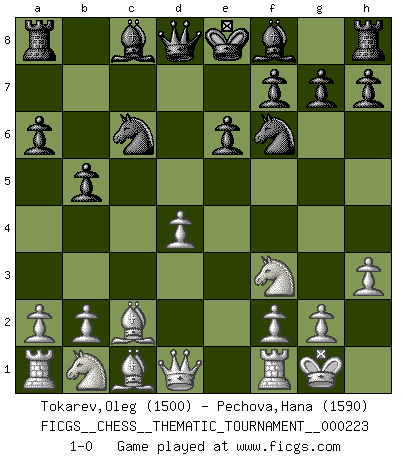 Last move : 1-0 2018 June 10 7:44:4 [Event "FICGS__CHESS__THEMATIC_TOURNAMENT__000223"] [Site "FICGS"] [Date "2018.03.09"] [Round "1"] [White "Tokarev,Oleg"] [Black "Pechova,Hana"] [Result "1-0"] [WhiteElo "1500"] [BlackElo "1590"] 1.e4 c5 2.Nf3 a6 3.c3 e6 4.d4 d5 5.Bd3 dxe4 6.Bxe4 Nf6 7.Bc2 Nc6 8.O-O cxd4 9.cxd4 b5 10.h3 1-0 Sicilian : O'Kelly variation Kingside Castling by player White (move 8) Player White won this chess game. Follow this game move after move (download)By the beauty of his games, the clarity of his play, and the brilliance of his ideas, Fischer made himself an artist of the same stature as Brahms, Rembrandt, and Shakespeare. (David Levy) Ohne Leiden bildet sich kein Charakter. (Ernst Freiherr von Feuchtersleben) El Ajedrez hace al hombre ser mas sabio y ver mas claro. (Vladimir Putin) En blitz, le Cavalier l'emporte sur le Fou. (Vlastimil Hort) A clear conscience is usually the sign of a bad memory. (Unknown)