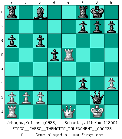 Last move : 0-1 2018 July 1 4:53:45 [Event "FICGS__CHESS__THEMATIC_TOURNAMENT__000223"] [Site "FICGS"] [Date "2018.03.09"] [Round "1"] [White "Kehayov,Yulian"] [Black "Schuett,Wilhelm"] [Result "0-1"] [WhiteElo "0928"] [BlackElo "1800"] 1.e4 c5 2.Nf3 a6 3.Be2 Nc6 4.O-O Nf6 5.d4 cxd4 6.Nxd4 Nxe4 7.Nxc6 bxc6 8.Bf3 Nf6 9.Nc3 d5 10.Be3 e5 11.h3 Bd6 12.Ne2 e4 13.Bg4 Nxg4 14.Bd4 Ne5 15.Re1 O-O 16.Ng3 Qh4 17.f4 exf3 18.Bxe5 Bxe5 19.Rxe5 Qxg3 20.Qe1 Qxg2+ 0-1 Sicilian : O'Kelly variation Kingside Castling by player White (move 4) Kingside Castling by player Black (move 15) Player Black won this chess game. Follow this game move after move (download)Bobby just drops the pieces and they fall on the right squares. (Miguel Najdorf) Ich bewundere Kasparows phantasievolle Angriffssiege aus den Achtzigern und Neunzigern, aber wenn man sie mit dem Computer überprüft, nimmt der Computer in jeder zweiten Partie die Opfer an, verteidigt sich und gewinnt. (Vladimir Kramnik) Muchos jugadores de Ajedrez se sorprendían cuando después de la partida, Fischer explicaba con calma: 'Yo ya había analizado esta posibilidad' en una posición en la cual yo creía que no era posible de prever desde la apertura. (Mikhail Tal) Soyez une menace à chaque fois que vous vous asseyez pour jouer. (Ken Smith) Chess, like love, like music, has the power to make people happy. (Siegbert Tarrasch)