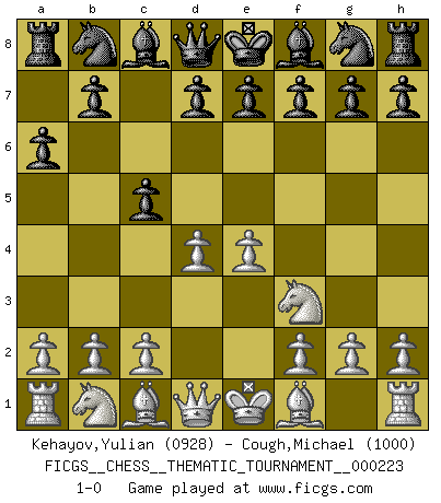 Last move : 1-0 2018 April 18 21:14:14 [Event "FICGS__CHESS__THEMATIC_TOURNAMENT__000223"] [Site "FICGS"] [Date "2018.03.09"] [Round "1"] [White "Kehayov,Yulian"] [Black "Cough,Michael"] [Result "1-0"] [WhiteElo "0928"] [BlackElo "1000"] 1.e4 c5 2.Nf3 a6 3.d4 1-0 This chess game has been lost on time (started : 2018.03.09 3:4:42) Sicilian : O'Kelly variation Player White won this chess game. Follow this game move after move (download)Only sissies Castle. (Rob Sillars) Über Karpov: Er war und ist ein Vertreter der russischen Reaktionäre. Das steckt tief in seiner Seele, wehalb ich nicht nett mit ihm umgehen kann. (Viktor Kortschnoi) Por tratar de evitar la pérdida de una pieza, muchas personas han perdido una partida de Ajedrez. (Savielly Tartakover) Horreur, mais aussi harmonie suprême : qu'y avait-il en effet au monde en dehors des échecs ? Le brouillard, l'inconnu, le non-être... (Vladimir Nabokov) Lamb in skin of tiger, still fears the wolf. (Chinese proverb)