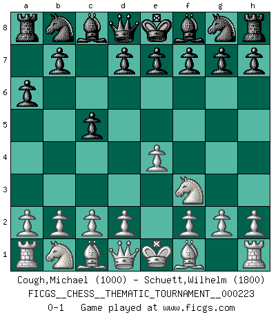 Last move : 0-1 2018 April 18 9:10:32 [Event "FICGS__CHESS__THEMATIC_TOURNAMENT__000223"] [Site "FICGS"] [Date "2018.03.09"] [Round "1"] [White "Cough,Michael"] [Black "Schuett,Wilhelm"] [Result "0-1"] [WhiteElo "1000"] [BlackElo "1800"] 1.e4 c5 2.Nf3 a6 0-1 This chess game has been lost on time (started : 2018.03.09 3:4:42) Sicilian : O'Kelly variation Player Black won this chess game. Follow this game move after move (download)Let the perfectionist play postal. (Yasser Seirawan) Man wirke der falschen Auffassung entgegen, als ob jeder Zug Unmittelbares zu leisten habe; auch Werte- und Ruhezüge haben ihre Existenzberechtigung. (Aaron Nimzowitsch) No puedes jugar al Ajedrez si eres de corazón noble. (Proverbio Francés) Aidez vos pièces, elles vous aideront. (Paul Morphy) I've never seen so many men wasted so badly. (Blondie in The Good, The Bad and The Ugly)