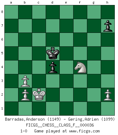 Last move : 1-0 2007 May 4 19:24:49 [Event "FICGS__CHESS__CLASS_F__000036"] [Site "FICGS"] [Date "2007.04.28"] [Round "1"] [White "Barradas,Anderson"] [Black "Gering,Adrien"] [Result "1-0"] [WhiteElo "1149"] [BlackElo "1099"] 1.e4 e5 2.Nf3 Nc6 3.Bb5 a6 4.Ba4 Bc5 5.c3 Nf6 6.d3 d6 7.O-O O-O 8.Re1 Bg4 9.Bg5 b5 10.Bb3 Na5 11.d4 exd4 12.cxd4 Bxf3 13.Qxf3 Bxd4 14.Nc3 Nxb3 15.axb3 Qd7 16.Rad1 Be5 17.Bxf6 Bxf6 18.e5 Bg5 19.Ne4 Bh6 20.exd6 Rfe8 21.Nc5 Qxd6 22.Qxa8 Rxa8 23.Rxd6 cxd6 24.Nxa6 g6 25.Nc7 Rb8 26.g3 b4 27.Na6 Rb7 28.Re4 Bc1 29.Re2 f5 30.Rc2 Bg5 31.Rc4 Bf6 32.Rc2 d5 33.Kf1 d4 34.Ke2 Rb6 35.Nc5 Rc6 36.Kd3 Kf7 37.Kc4 Rc8 38.Kd3 Ke7 39.f3 Rc7 40.g4 Kd6 41.Na6 Rb7 42.Rc4 Re7 43.gxf5 Re3+ 44.Kc2 gxf5 45.Nxb4 Rxf3 46.Rc6+ Ke5 47.Nd3+ Ke4 48.Re6+ Kd5 49.Rxf6 f4 50.Rxf4 Rxf4 51.Nxf4+ 1-0 Ruy Lopez : Classical defense deferred Kingside Castling by player White (move 7) Kingside Castling by player Black (move 7) 10 pieces endgame at move 50 : White KRNPPP , Black KRPP WHITE : King + 1 Rook 1 Knight 3 Pawns BLACK : King + 1 Rook 2 Pawns 9 pieces endgame at move 50 : White KNPPP , Black KRPP WHITE : King + 1 Knight 3 Pawns BLACK : King + 1 Rook 2 Pawns 8 pieces endgame at move 51 : White KNPPP , Black KPP WHITE : King + 1 Knight 3 Pawns BLACK : King + 2 Pawns Player White won this chess game. Follow this game move after move (download)You may learn much more from a game you lose than from a game you win. You will have to lose hundreds of games before becoming a good player. (Jose Raul Capablanca) In der Schule lernt man nichts. Es ist nur Zeitverschwendung. (Robert James Fischer) Los libros de Ajedrez deben de usarse igual como usamos los anteojos: para mejorar la vista, aunque algunos jugadores los quieren usar como si ellos les otorgaran la vision. (José Raúl Capablanca) Vous savez, camarade Pachman, je n'éprouve pas de plaisir à être ministre, je jouerais plutôt aux échecs comme vous, ou alors ferais une révolution au Venezuela. (Che Guevara à Ludek Pachman, 'Checkmate in Prague', 1975) That's absurd. I love it. (Gregory House, House M.D.)