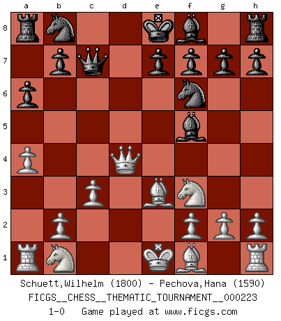 Last move : 1-0 2018 June 19 15:20:59 [Event "FICGS__CHESS__THEMATIC_TOURNAMENT__000223"] [Site "FICGS"] [Date "2018.03.09"] [Round "1"] [White "Schuett,Wilhelm"] [Black "Pechova,Hana"] [Result "1-0"] [WhiteElo "1800"] [BlackElo "1590"] 1.e4 c5 2.Nf3 a6 3.c3 d5 4.exd5 Qxd5 5.d4 Nf6 6.dxc5 Qxc5 7.a4 Bf5 8.Be3 Qc7 9.Qd4 1-0 This chess game has been lost on time (started : 2018.03.09 3:4:42) Sicilian : O'Kelly variation Player White won this chess game. Follow this game move after move (download)The passed Pawn is a criminal, who should be kept under lock and key. Mild measures, such as police surveillance, are not sufficient. (Aaron Nimzovich) Ein Isolani verdüstert die Stimmung auf dem ganzen Schachbrett. (Savielly Grigorievitsch Tartakower) Una clavada es mas poderosa que una espada. (Fred Reinfeld) Les pièces de l'échiquier étaient impitoyables. Elles le retenaient, elles l'absorbaient. Il y avait de l'horreur en cela, mais aussi une harmonie unique. Car, qu'y a-t-il dans le monde, à part les échecs ? (V. Nabokov) If everyone is thinking alike, then somebody isn't thinking. (US General George S. Patton)