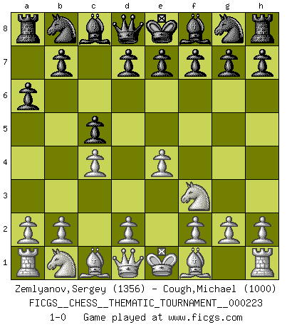 Last move : 1-0 2018 April 19 9:17:18 [Event "FICGS__CHESS__THEMATIC_TOURNAMENT__000223"] [Site "FICGS"] [Date "2018.03.09"] [Round "1"] [White "Zemlyanov,Sergey"] [Black "Cough,Michael"] [Result "1-0"] [WhiteElo "1356"] [BlackElo "1000"] 1.e4 c5 2.Nf3 a6 3.c4 1-0 This chess game has been lost on time (started : 2018.03.09 3:4:42) Sicilian : O'Kelly variation Player White won this chess game. Follow this game move after move (download)When the Chess game is over, the Pawn and the King go back to the same box. (Irish saying) Ja, jede Frau in Holland liebt mich bestimmt, und alle Männer hassen mich. (Loek van Wely) Bobby Fischer es el jugador de Ajedrez mas grande que jamás haya existido. (Ken Smith) On peut tirer plus d'utilité d'une partie perdue que de 100 parties gagnées. (Capablanca) If I had no sense of humor, I would long ago have committed suicide. (Mahatma Gandhi)