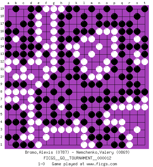 Last move : 1-0 2018 May 19 15:26:31 [Event "FICGS__GO__TOURNAMENT__000012"] [Site "FICGS"] [Date "2018.03.09"] [Round "1"] [Black "Bromo,Alexis"] [White "Nemchenko,Valery"] [Result "1-0"] [Rating 1 "0787"] [Rating 2 "0869"] 1.q16 d4 2.d16 q4 3.q10 d10 4.k16 k4 5.k10 e12 6.f13 f11 7.g10 f10 8.f9 e9 9.e8 d8 10.e7 d7 11.e6 d6 12.e5 e4 13.f4 f3 14.g4 g3 15.h4 h3 16.j4 j3 17.k5 l3 18.l4 k3 19.m3 l2 20.m2 m1 21.n1 l1 22.n2 g11 23.h11 g12 24.h12 g13 25.h13 g14 26.h14 g15 27.h15 g16 28.h16 g17 29.h17 g18 30.h18 h19 31.j19 g19 32.d15 d14 33.c14 e13 34.e14 e15 35.d13 f14 36.d14 e16 37.d17 e17 38.d18 e18 39.e19 f19 40.d19 d12 41.c12 c11 42.b11 b12 43.c13 a11 44.b13 b10 45.a13 a12 46.j18 p6 47.o6 o5 48.p7 q6 49.q7 r7 50.r8 s8 51.s7 r6 52.s9 s6 53.t8 t6 54.p3 p4 55.o3 q3 56.q2 p2 57.p1 r2 58.o2 r1 59.q1 s3 60.n5 o4 61.n4 o16 62.p17 p15 63.q15 p14 64.q14 p13 65.q13 q12 66.r12 q11 67.r11 p10 68.p9 q9 69.r10 p8 70.q8 o9 71.o8 p9 72.n9 n10 73.m9 m10 74.l10 l11 75.k11 l12 76.k12 k13 77.j13 k14 78.k15 l15 79.l16 m15 80.m16 n16 81.n17 n14 82.o17 p16 83.q17 s17 84.s16 t16 85.t15 t17 86.r17 s15 87.r16 r18 88.s18 t18 89.t19 d5 90.s14 t7 91.s8 b17 92.b16 a16 93.a15 b15 94.a17 c16 95.a16 a18 96.a14 c18 97.c17 b18 98.c15 q18 99.p18 p19 100.o19 q19 101.r19 pass 102.c3 d3 103.c4 c2 104.b2 b3 105.b4 a3 106.a2 b1 107.a4 a1 108.c1 d2 109.c5 c6 110.b6 b7 111.a6 a7 112.d1 e1 113.b1 f2 114.b9 c8 115.c9 b8 116.a9 c10 117.r9 n8 118.o7 n6 119.n7 m8 120.l9 l8 121.m7 m6 122.l6 k8 123.j8 k7 124.j6 k6 125.m5 j7 126.h7 h6 127.j5 h8 128.g8 g7 129.h9 j9 130.j10 k9 131.g6 f6 132.g5 f5 133.f7 c19 134.b19 a19 135.b19 j14 136.j15 m13 137.l7 pass 138.h7 m17 139.l17 a8 140.j8 m18 141.l18 l19 142.n18 n19 143.m19 pass 144.p11 o11 145.p12 o12 146.k19 s13 147.r14 t14 148.o10 n11 149.t13 t12 150.t14 s12 151.s11 pass 152.pass 1-0 Here are the names of the openings (joseki) played in the four corners : Corner d16 : d16 e12 Hoshi (Hwajeom, Seongjeom, Xingwei`) 4-4 Point. The star or hoshi (4-4) point, emphasizing influence at the potential expense of territory. Corner d4 : d4 f9 Hoshi (Hwajeom, Seongjeom, Xingwei`) 4-4 Point. The star or hoshi (4-4) point, emphasizing influence at the potential expense of territory. Corner q16 : q16 o16 Hoshi (Hwajeom, Seongjeom, Xingwei`) 4-4 Point. The star or hoshi (4-4) point, emphasizing influence at the potential expense of territory. Ikken Takagakari (Hankan Nop'dakeolch'im, Yi Gaojia, 1-Space High Approach). Black typically responds at 6-4 or 3-10. Black 4-10 is played when Black finds play on the right side advantageous. Black 4-8 or 3-8 may be played when Black has support at top. Player Black won this Go (weiqi, baduk) game. Follow this game move after move (download)Don't count territory held by only one eye. (Anonymous) There is a very easy way to return from a casino with a small fortune : go there with a large one. (Jack Yelton)