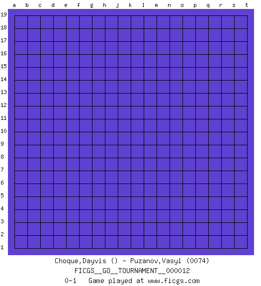 Last move : 0-1 2018 April 8 8:31:37 [Event "FICGS__GO__TOURNAMENT__000012"] [Site "FICGS"] [Date "2018.03.09"] [Round "1"] [Black "Choque,Dayvis"] [White "Puzanov,Vasyl"] [Result "0-1"] [Rating 2 "0074"] 0-1 This go game has been lost on time (started : 2018.03.09 4:28:29) Here are the names of the openings (joseki) played in the four corners : Player White won this Go (weiqi, baduk) game. Follow this game move after move (download)In the opening, when you don't know what to play, make a shimari. (Jansteen) It is not titles that honor men, but men that honor titles. (Niccolo Machiavelli)