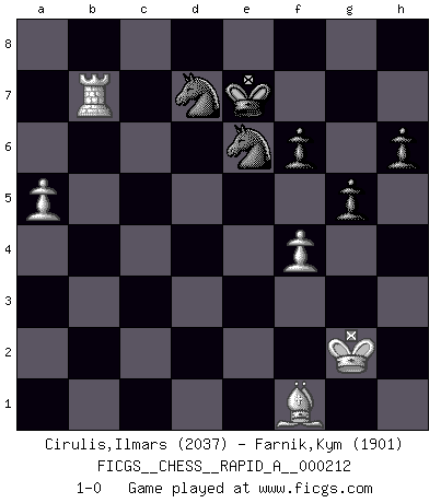 Last move : 1-0 2018 April 18 11:19:54 [Event "FICGS__CHESS__RAPID_A__000212"] [Site "FICGS"] [Date "2018.03.11"] [Round "1"] [White "Cirulis,Ilmars"] [Black "Farnik,Kym"] [Result "1-0"] [WhiteElo "2037"] [BlackElo "1901"] 1.b4 Nf6 2.Nf3 d5 3.e3 Bg4 4.c4 e5 5.cxd5 Nxd5 6.Qa4+ Qd7 7.b5 Bxf3 8.gxf3 c6 9.Qe4 Bd6 10.bxc6 bxc6 11.Rg1 O-O 12.Na3 Qc7 13.Nc4 Nd7 14.Qg4 g6 15.h4 Kh8 16.Bb2 Rab8 17.Be2 N5b6 18.Nxd6 Qxd6 19.Rc1 Nd5 20.Ba1 Rb4 21.Qh3 Rfb8 22.Kf1 N5f6 23.Rd1 c5 24.h5 Rb1 25.Kg2 Rxd1 26.Rxd1 Nxh5 27.f4 Nhf6 28.fxe5 Nxe5 29.Qh4 Kg8 30.d4 Ned7 31.dxc5 Qxc5 32.Bf3 Rb4 33.e4 Rb6 34.Bd4 Qc7 35.Bxb6 axb6 36.Qg5 Kg7 37.Qd2 Qe5 38.Qd6 Qg5+ 39.Qg3 Qc5 40.Qf4 Ne5 41.Be2 h6 42.Qc1 Qb4 43.Qe3 Qxe4+ 44.Qxe4 Nxe4 45.Rd5 f6 46.f4 Nf7 47.Rd7 Nc5 48.Rc7 Kf8 49.Rc6 Ke7 50.Rxb6 Nd8 51.Rb4 g5 52.a4 Nc6 53.Rb6 Nd4 54.Bf1 Nd7 55.Rb7 Ne6 56.a5 1-0 Polish (Sokolsky) opening Kingside Castling by player Black (move 11) Player White won this chess game. Follow this game move after move (download)A good player is always lucky. (Jose Raul Capablanca) Über Karpov: Er war und ist ein Vertreter der russischen Reaktionäre. Das steckt tief in seiner Seele, wehalb ich nicht nett mit ihm umgehen kann. (Viktor Kortschnoi) Todo lo que importa ante el tablero de Ajedrez son buenas jugadas. (Bobby Fischer) Les échecs sont un jeu par leur forme, un art par leur essence et une science par sa difficulté d'acquisition. Ils peuvent vous procurer autant de plaisir qu'un bon livre ou une belle musique, mais vous n'aurez une réelle joie que si vous arrivez à bien jouer. (Tigran Petrosian) The only thing that matters is the evidence. (Horatio Caine, C.S.I. Miami)